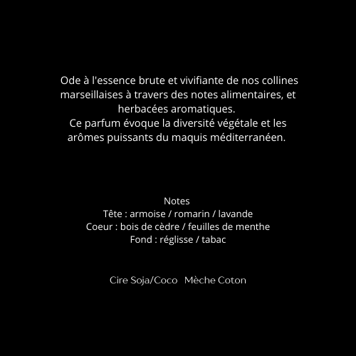 La bougie Gineste est une invitation au cœur du maquis méditerranéen. Inspirée par les paysages sauvages et lumineux des collines marseillaises, elle dévoile une fragrance aromatique, herbacée et boisée qui évoque la garrigue chauffée par le soleil.
