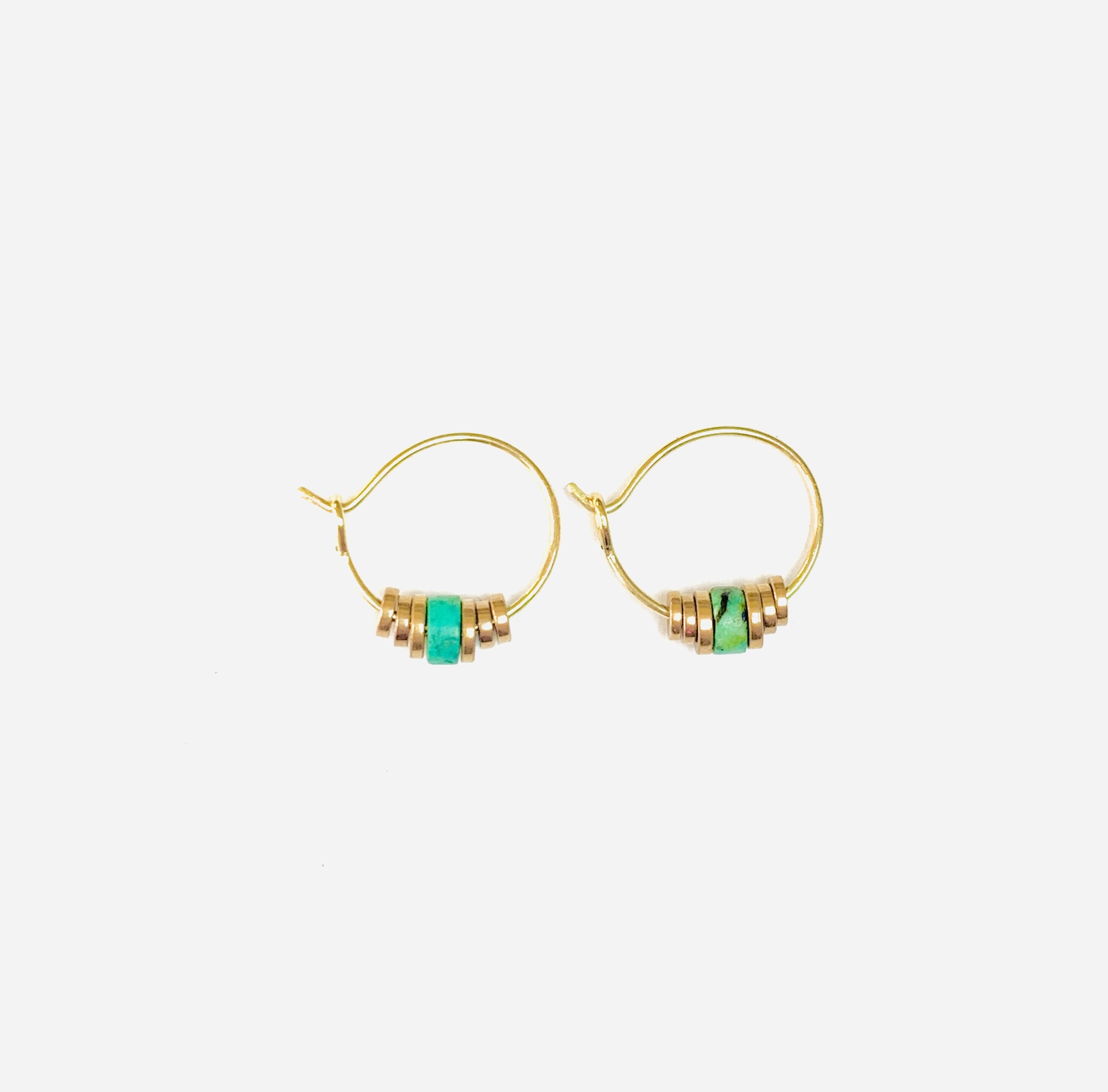 Rondelles Hématites 3 et 4mm Rose Gold et Turquoise d’Afrique montées sur une créoles de 15mm dorées à l’or fin 1 micron